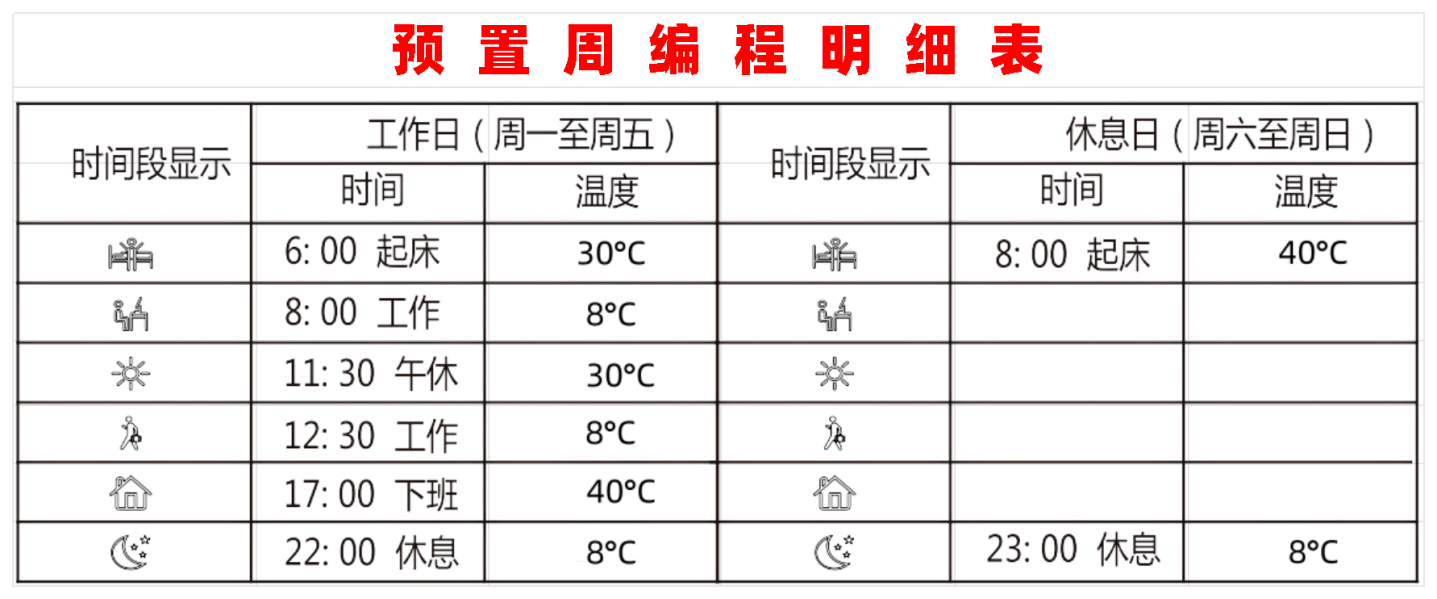 优点二、具有周编程功能,定时定温开关机,舒适、方便、节能、环保。