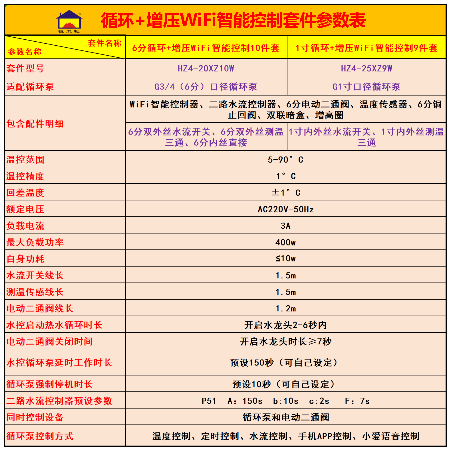 v 恒尔暖循环+增压WiFi智能控制套件,配套安装的水泵功率不得高于400w,如高于,请使用交流接触器间接控制。